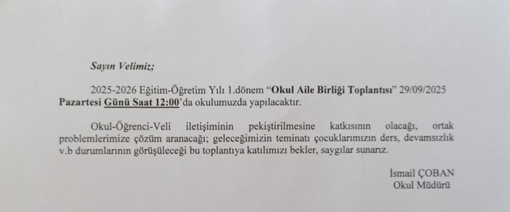"OKUL AİLE BİRLİĞİ TOPLANTIMIZ" 29/09/2025/PAZARTESİ GÜNÜ YAPILACAKTIR. TÜM VELİLERİMİZE DUYURULUR...